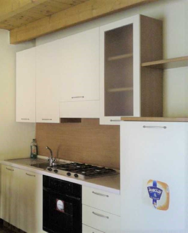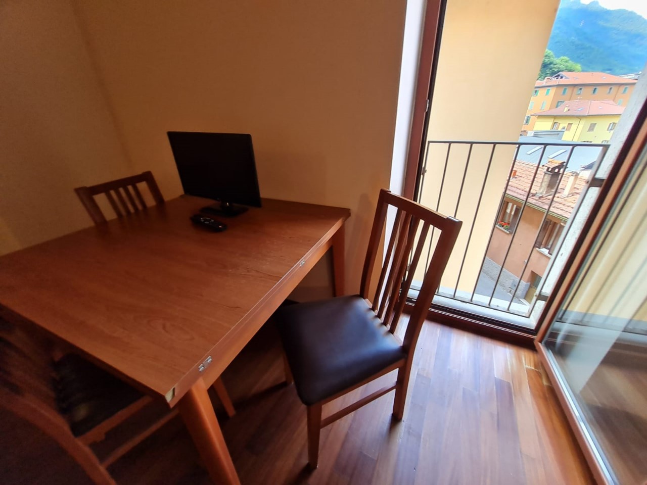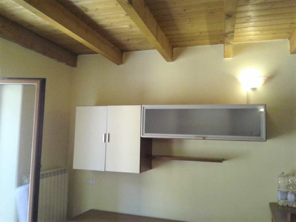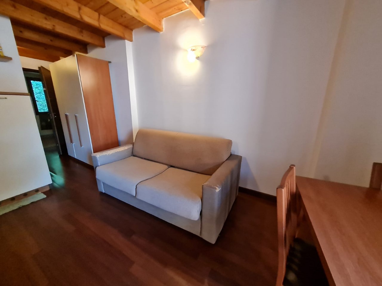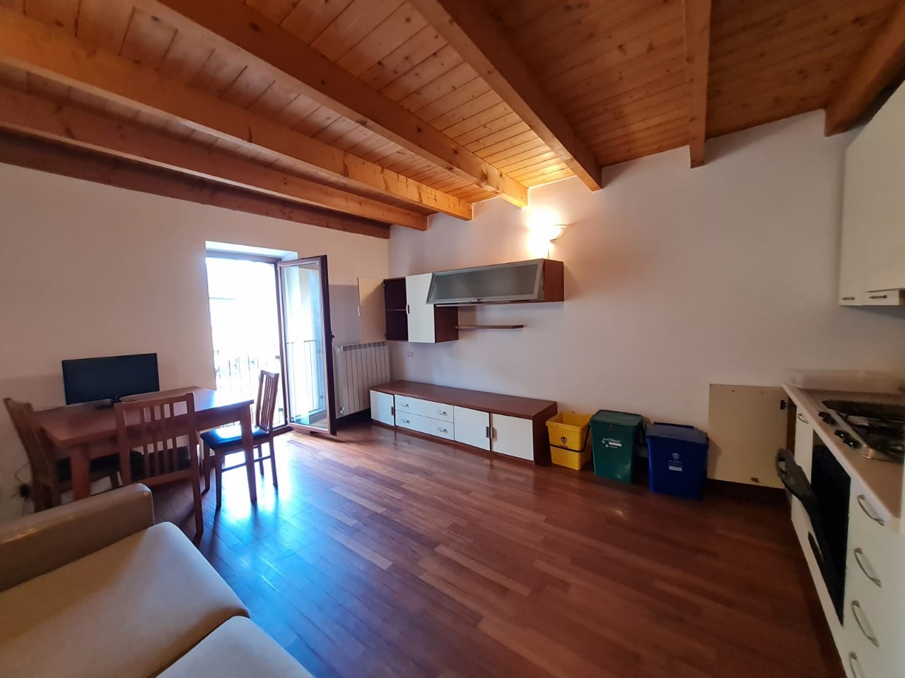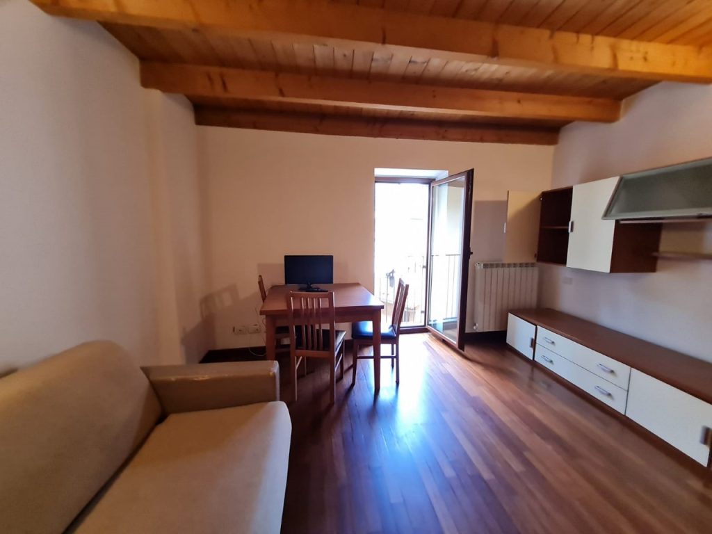 Breno: In palazzina, monolocale arredato con travi a vista e parquet, composto da soggiorno con angolo cottura, divano letto e bagno con box doccia.